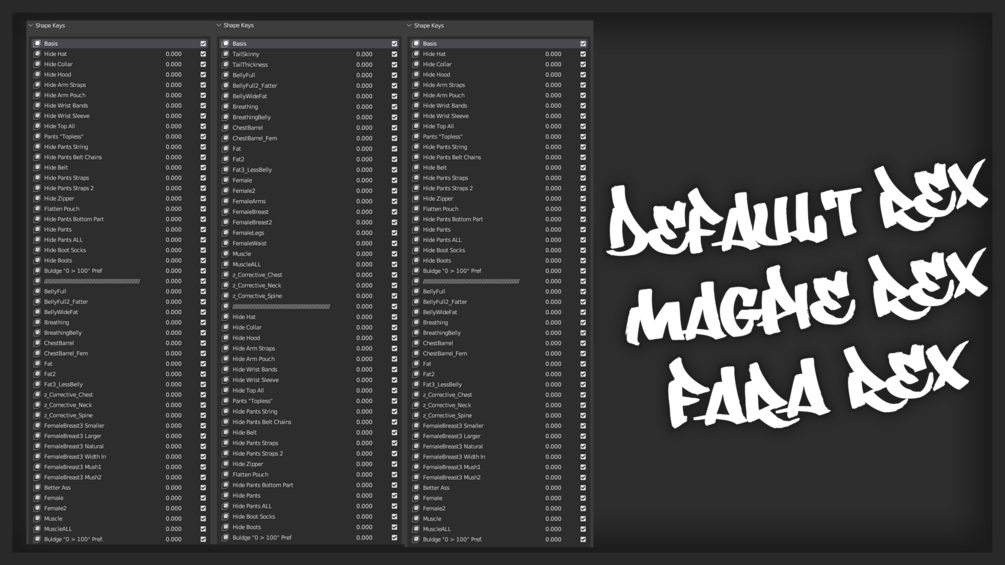 DEFAULT REX / MAGPIE REX V6 / FARA REX> Please use "Hide Mesh" Avatar Blendshapes when applying Clothing!